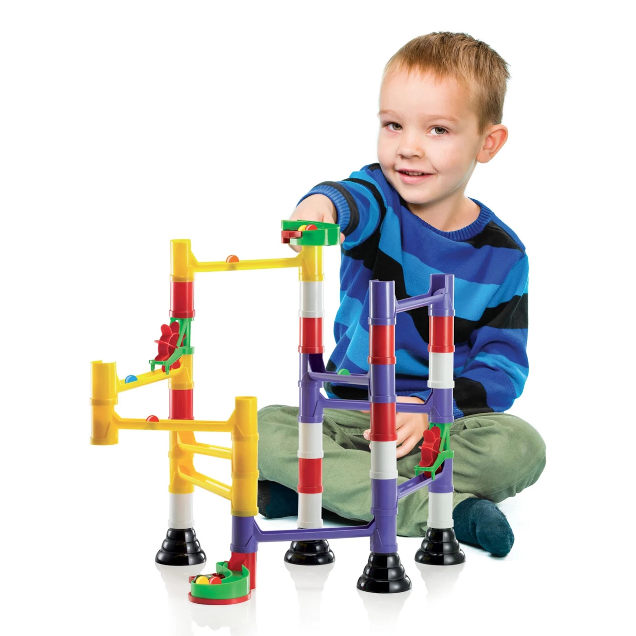 Elementele modulare permit construirea de circuite mici sau turnuri înalte, spirale și poduri; fiecare piesă se îmbină perfect pentru construcții stabile și sigure. Pista pentru bile este ușor extensibilă cu alte piese și seturi din aceeași gamă, rezultând combinații nesfârșite de trasee și obstacole. Materialele de calitate, rezistente, și suprafețele netede asigură mișcarea fluidă a bilelor colorate și o durată de viață îndelungată.