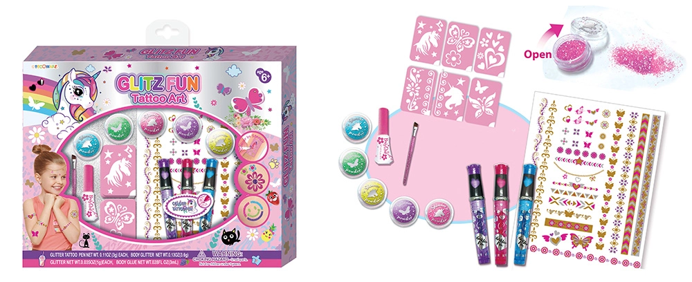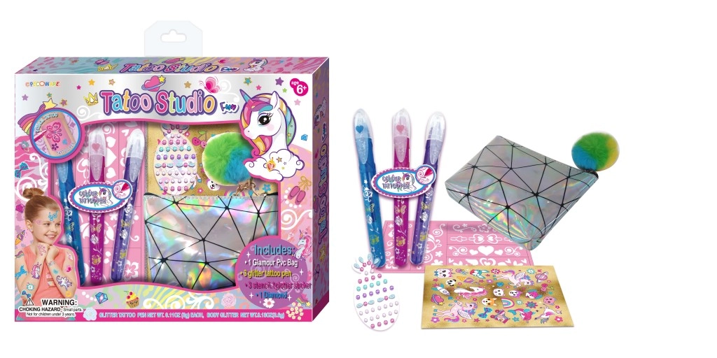 Lăsați copiii să-și deschidă propriul studio de tatuaje și să-și transforme imaginația în culori pe piele – categoria Tattoo artistă înseamnă joc creativ, fără durere și sigur de-a v-ați juca de-a profesiile. Tatuajele temporare pentru copii, tatuajele pentru cei mici și seturile de tatuaje pentru micile tatuatoare aduc o experiență autentică de salon de frumusețe fără ace, doar multă distracție și idei.