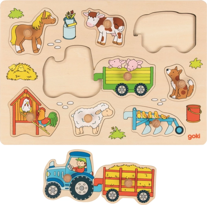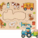 Puzzle din lemn colorat, cu tematică de fermă și tractor, care îi va încânta pe cei mai mici. Conține nouă piese cu mânere practice pentru manipulare ușoară și antrenează motricitatea fină, coordonarea mână–ochi și gândirea logică. Datorită plăcii de lemn și chenarurilor, piesele stau fix la locul lor. Potrivit pentru copii de la 1 an.