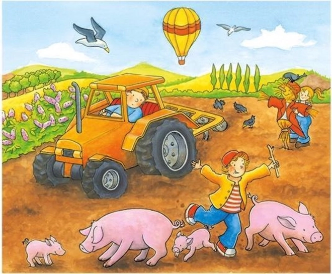 Asamblați scene cu tractorul, copiii și animăluțele. 12 cuburi formează 6 ansambluri și exersează percepția formelor, culorilor și asamblarea logică.