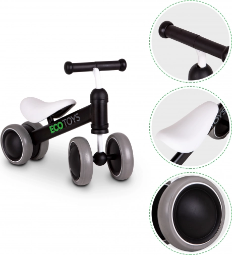 Bicicleta de echilibru mini ECO TOYS, ușoară și stabilă, pentru cei mai mici, este ideală pentru interior și exterior. Datorită celor două roți din față, blocării ghidonului și șeii moi din spumă, susține echilibrul și motricitatea copiilor de la 18 la 36 de luni. Roțile moi, antiderapante nu zgârie podeaua, iar construcția rezistentă, dar ușoară (2,2 kg) asigură o plimbare sigură și confortabilă.