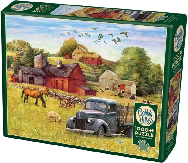 Puzzle-ul prezintă o scenă fermecătoare de fermă cu un hambar roșu, un camion vechi și animale păscând pe pajiște.