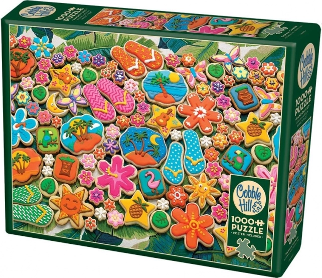 Bucurați-vă de ore întregi de distracție cu puzzle-ul premium COBBLE HILL cu motiv de biscuiți tropicali, din 1000 de piese. Datorită formelor unice și neregulate ale pieselor și tiparului de înaltă calitate, acest puzzle oferă o dificultate ridicată, forme originale și culori intense. În pachet este inclusă și o imagine de referință pentru o asamblare mai confortabilă.