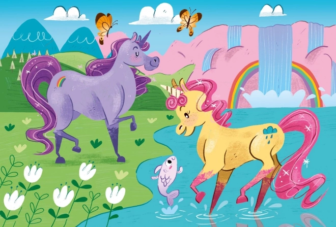 Un set drăguț de două puzzle-uri pentru copii CLEMENTONI, cu tematică de unicorni, include 2×20 de piese pentru o asamblare plină de bucurie. Datorită stratului lucios cu efect de diamant, fiecare imagine strălucește, iar culorile vii SuperColor rămân frumoase pe termen lung. Puzzle-urile dezvoltă îndemânarea manuală și capacitatea de observație și sunt potrivite de la 3 ani. Dimensiunea puzzle-ului asamblat este aprox. 27 × 19 cm.
