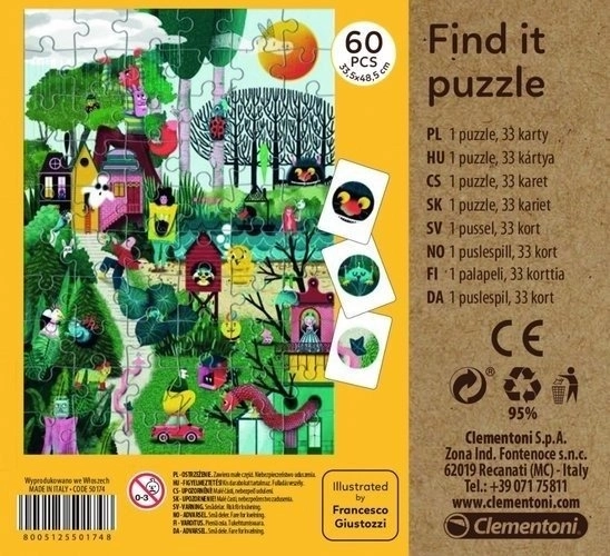Puzzle cu motiv de basm de toamnă și 33 de cărți, datorită cărora distracția nu se termină odată cu asamblarea imaginii. După ce ați terminat motivul, căutați pe imaginea asamblată elementul ilustrat pe cartea extrasă. Veți reuși să le găsiți pe toate? Pachetul include și un model de referință. Puzzle-ul pentru copii face parte din programul ecologic CLEMENTONI Play for Future, creat pentru a le transmite copiilor importanța sustenabilității și a protecției mediului.