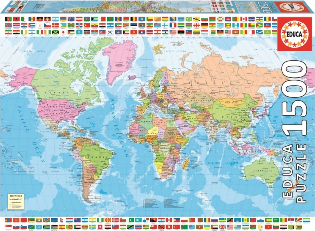 Descoperă lumea cu puzzle-ul de calitate EDUCA din 1500 de piese, care afișează o hartă politică a lumii detaliată. Pachetul include adeziv gratuit pentru fixarea ușoară a imaginii finale cu dimensiunea de aproximativ 85 × 60 cm.