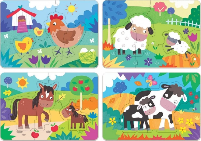 Setul include patru puzzle-uri separate, cu grade diferite de dificultate. Datorită progresiei de la 5 la 8 piese, copiii capătă în mod natural siguranță în asamblare și se bucură de fiecare imagine finalizată.