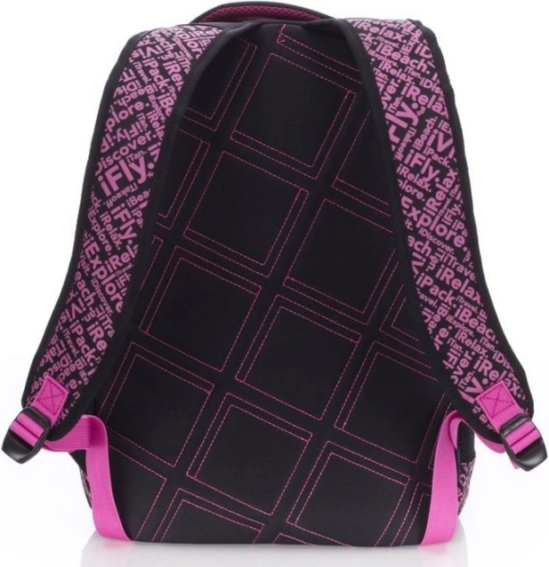 Rucsac negru cu accente roz, care combină stilul cu funcționalitatea, potrivit pentru utilizarea zilnică.