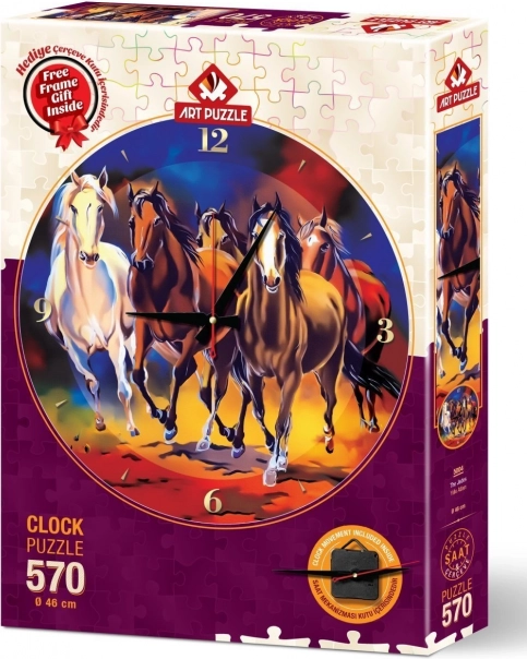 Asamblarea este ușoară: după lipirea puzzle-ului pe suportul inclus, montați rama, introduceți motivul, fixați clemele și montați mecanismul de ceas. Rezultatul este un ceas decorativ cu diametrul de aproximativ 46 cm, care va încânta iubitorii de cai și pasionații de puzzle-uri.