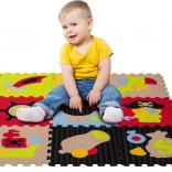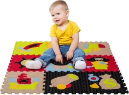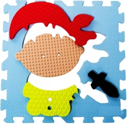 Puzzle-ul din spumă cu tematică de pirați transformă orice cameră într-o zonă de joacă sigură. Nouă piese interconectabile, cu forme detașabile și structuri de suprafață diferite, îi atrag pe copii prin culori și la atingere. Materialul este plăcut moale, ușor de curățat și amortizează loviturile și zgomotul.
