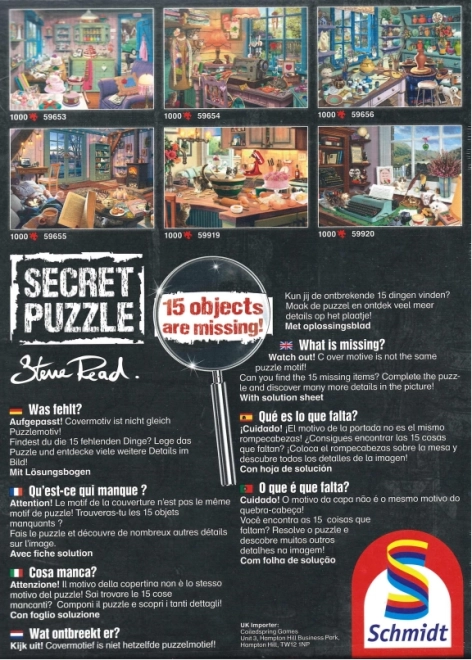 Adu-ți concentrarea și abilitățile de detectiv la limite cu puzzle-ul Colecția Secret de la Schmidt. Acest puzzle unic aduce 15 diferențe pe care le vei descoperi numai pe parcursul construirii. Ceea ce vezi pe cutie nu este ceea ce primești pe planșă. Este timpul să explorezi fiecare piesă și să dezvălui adevărul ascuns!