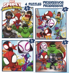 Puzzle-ul progresiv SPIDEY și prietenii lui uimitori 4în1 aduce copiilor bucuria asamblării și, în același timp, îi învață discret concentrarea și răbdarea. Cele patru puzzle-uri diferite, cu 12, 16, 20 și 25 de piese, permit o trecere lină către imagini mai solicitante și susțin dezvoltarea gândirii logice.