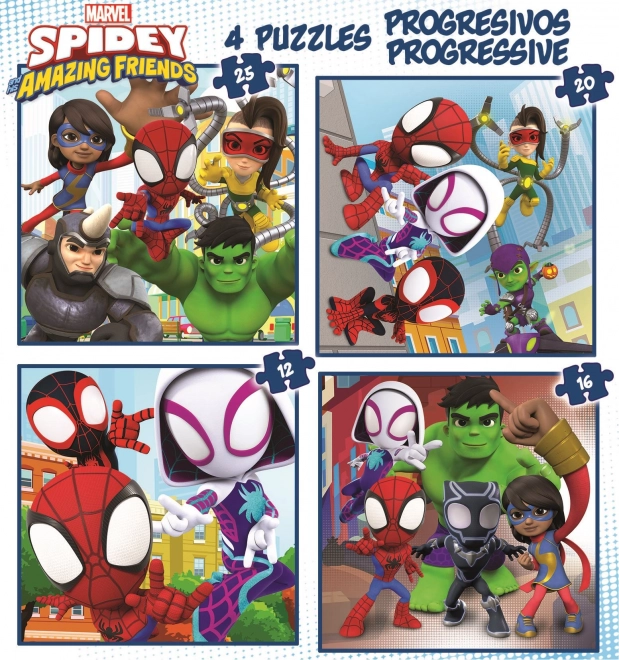 Bucurați-vă de distracție pentru micii fani ai lui SPIDEY cu puzzle-uri progresive 4în1. Setul conține patru puzzle-uri cu dificultăți diferite (12, 16, 20 și 25 piese), astfel încât copiii își pot dezvolta treptat abilitățile. Fiecare puzzle are dimensiunea de aproximativ 16 × 16 cm, iar odată cu creșterea numărului de piese scade mărimea lor, ceea ce susține motricitatea fină și răbdarea. Ideal pentru preșcolari, dificultate progresivă și personajele îndrăgite SPIDEY și prietenii săi.