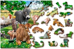 Puzzle-ul din lemn WOODEN CITY oferă nu doar distracție nesfârșită, ci și o experiență estetică datorită pieselor special formate. Piesele în formă de animale și obiecte sunt îmbogățite cu detalii realizate cu laser, care pot servi și ca mici figurine. Datorită designului pe două părți, puzzle-ul poate fi asamblat fie după imaginea de pe o parte, fie după modelul formelor de pe cealaltă. Acest concept nu doar că oferă un nivel mai ridicat de dificultate, dar stimulează și rezolvarea problemelor și percepția spațială.