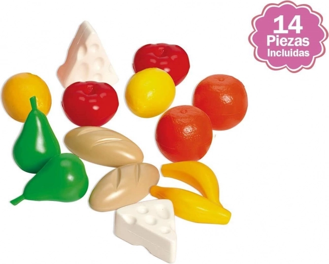 Include alimente din plastic, inclusiv fructe (pere, mere, banane) și alte piese pentru un joc variat.