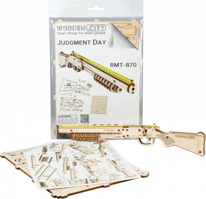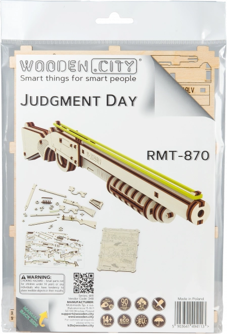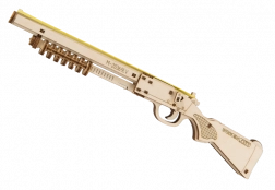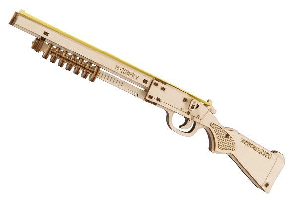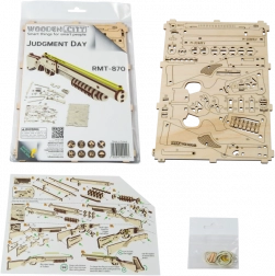 Asamblați un model autentic al unei arme care trage cu benzi de cauciuc și include detalii elaborate precum siguranța și magazinul de muniție. Modelul poate fi asamblat ușor datorită materialelor ecologice din lemn și nu necesită adeziv sau unelte.