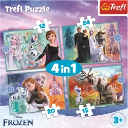 Puzzle-ul 4v1 conține un număr variat de bucăți (12, 15, 20, 24), oferind combinația ideală pentru copiii de vârste diferite. După asamblare, vor apărea imagini frumoase din lumea Regatului de gheață.