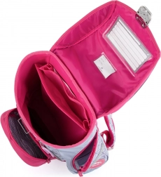 Compartimentul principal este suficient de încăpător pentru toate cele necesare în clasele 1 și 2, iar buzunarul frontal este ideal pentru gustare. Fundul rigid protejează conținutul și crește stabilitatea împotriva răsturnării. Catarama de siguranță ușurează închiderea, iar elementele reflectorizante sporesc vizibilitatea copilului la amurg și pe întuneric.