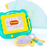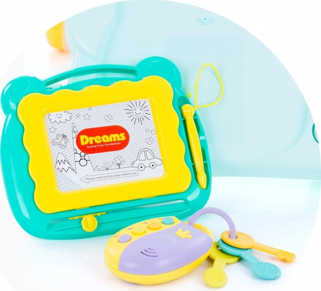 - lumini, melodii și sunete; tablă de desen cu stilou; oglindă; roți dințate; chei detașabile cu telecomandă