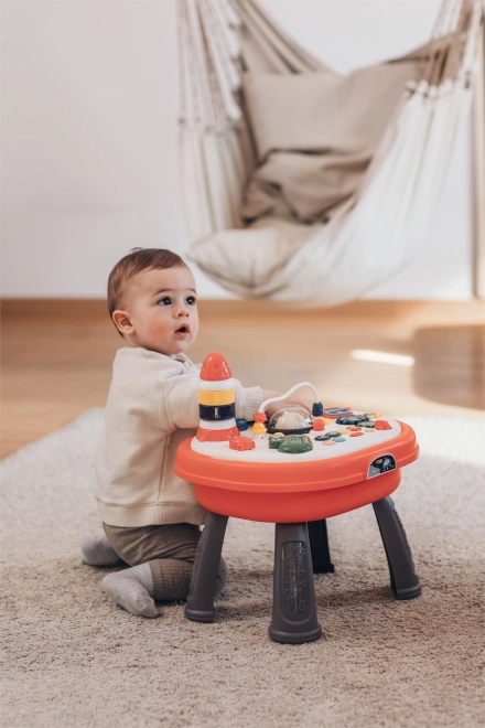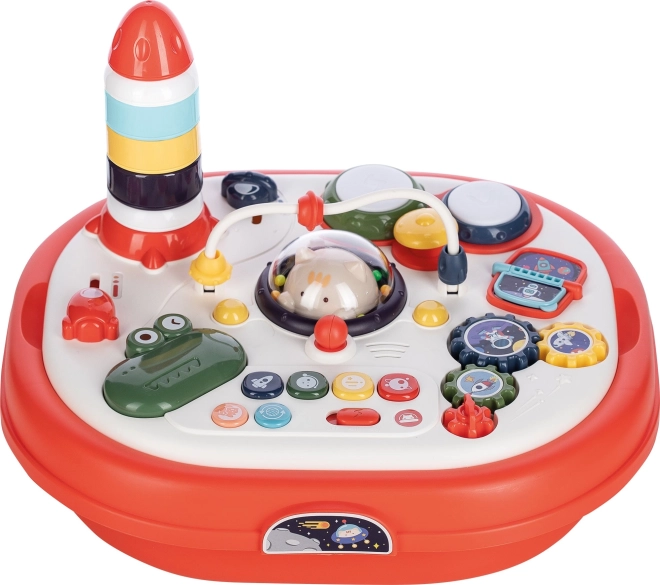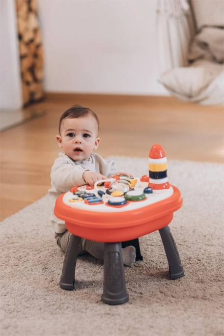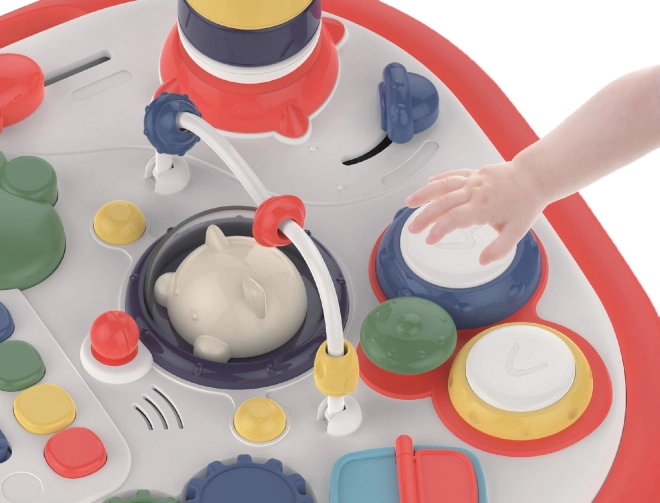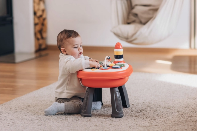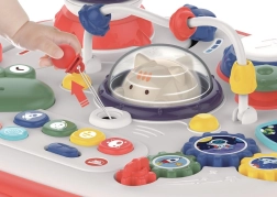 Măsuță interactivă distractivă pentru cei mici, care dezvoltă percepția senzorială, motricitatea fină și creativitatea. Oferă efecte luminoase și sonore, reglaj al volumului pe două trepte, panou rotativ cu față pentru construcții de tip lego și multe butoane, rotițe dințate și elemente de joc. Panoul poate fi scos, iar măsuța poate servi și ca cutie de depozitare pentru jucării.