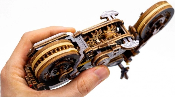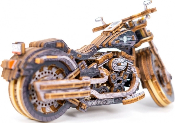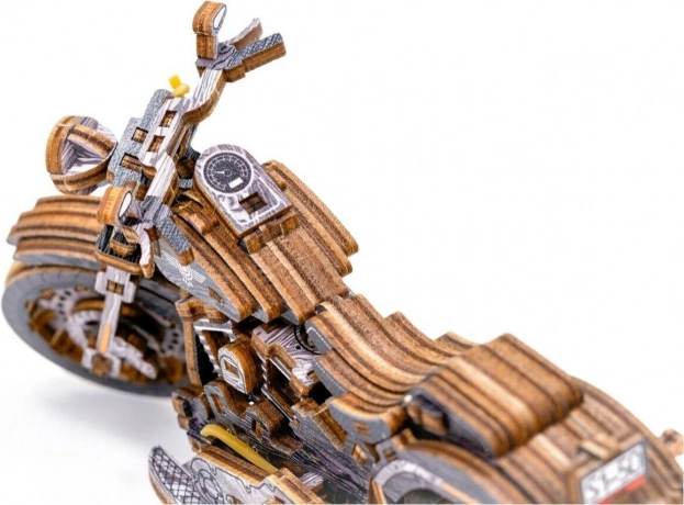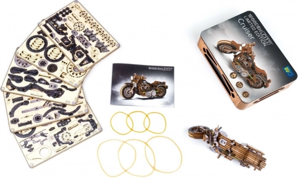 Wooden City Cruiser V-Twin puzzle 3D din lemn oferă o experiență autentică de construcție a unui model mecanic fără utilizarea adezivului sau a uneltelor. Acest model este realizat din placaj de mesteacăn ecologic și conține detalii funcționale ale unei motociclete reale. Modelul motocicletei oferă: