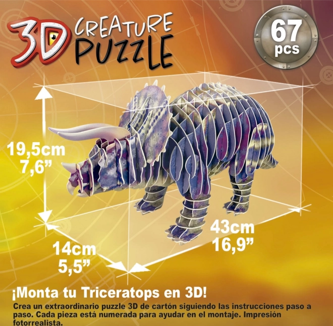 Descoperă modelul 3D unic de triceratops, pe care îl asamblezi ușor urmând piesele numerotate și instrucțiunile clare ilustrate. Piesele se desprind simplu din carton și se îmbină perfect – nu este nevoie de lipici sau foarfecă.