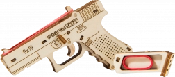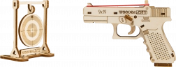 Modelul oferă elemente fidele unui pistol real – siguranță, încărcător și un corp realizat cu precizie din placaj tăiat cu laser.