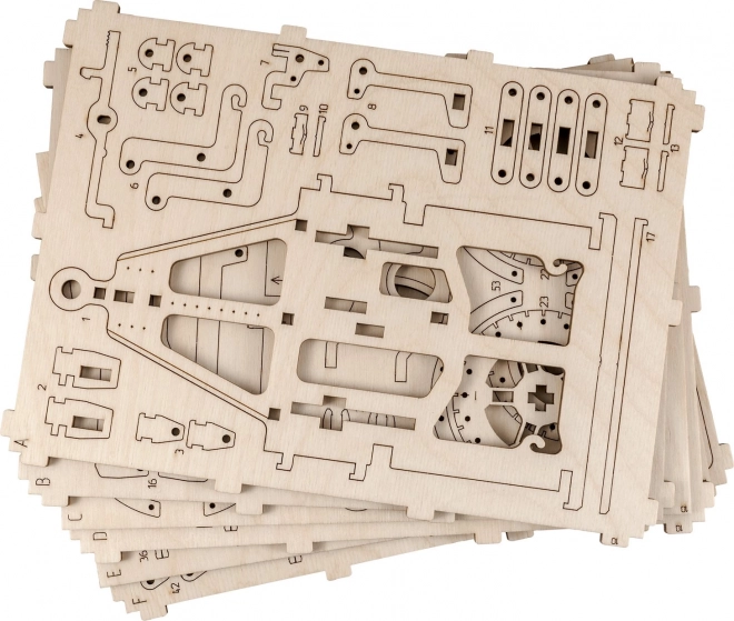 119 piese tăiate cu laser din placaj de mesteacăn se îmbină perfect. Construcția este curată, intuitivă și accesibilă chiar și pentru începători.