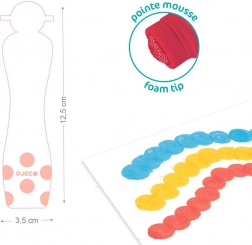 Culorile spumoase DJECO cu aplicator practic cu burete sunt alegerea ideală pentru primele creații. Copiii doar apasă și realizează puncte, linii și modele – fără pensule și fără murdărie. Sticluțele ergonomice se potrivesc și mâinilor mici ale copiilor și susțin priza naturală.