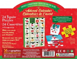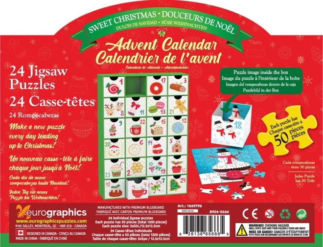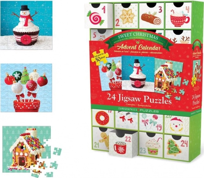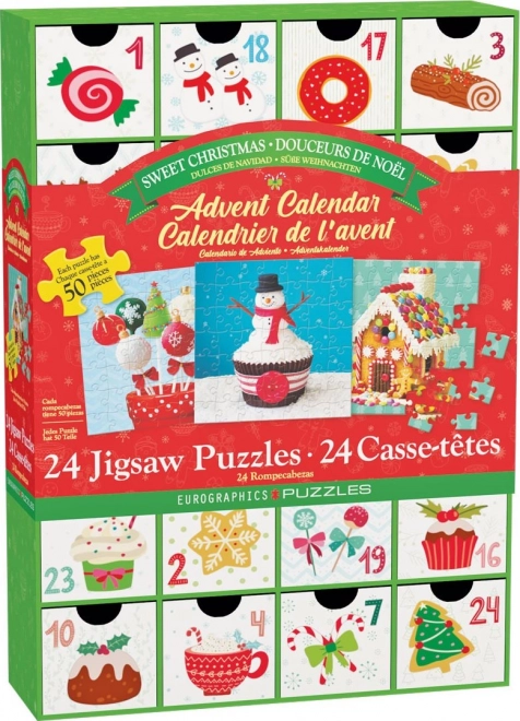 Calendarul de advent EUROGRAPHICS „Dulciuri de Crăciun” transformă luna decembrie într-o tradiție ludică. Fiecare dintre cele 24 de sertărașe ascunde un puzzle pătrat de 50 de piese cu motive delicioase de dulciuri. Imaginile au dimensiunea de 12,5 × 12,5 cm, iar modelul este tipărit pe partea din spate a fiecărui sertăraș pentru o asamblare ușoară.