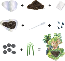 Piese pentru decor, ghiveci în formă de inimă, pipetă, pachet de pământ, plic cu semințe și instrucțiuni clare. Trebuie doar să asamblezi, să semeni și să uzi regulat.