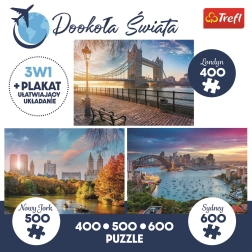 Admirați orașele lumii cu acest puzzle unic de la TREFL. Setul conține trei motive diferite, cu un total de 1500 de piese, împărțite în 400 de piese pentru Londra, 500 de piese pentru New York și 600 de piese pentru Sydney.