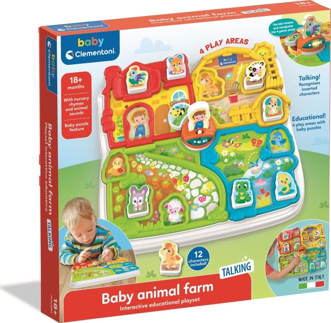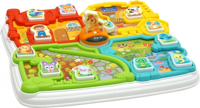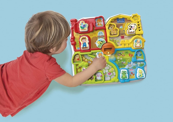 Ferma interactivă oferă patru zone colorate distincte – fermă, grajd, grădină și iaz. Include de asemenea un set de 12 piese pe care copiii le pot folosi ca figurine la alte jocuri. O albină rotativă în jurul podului asigură un alt element distractiv.