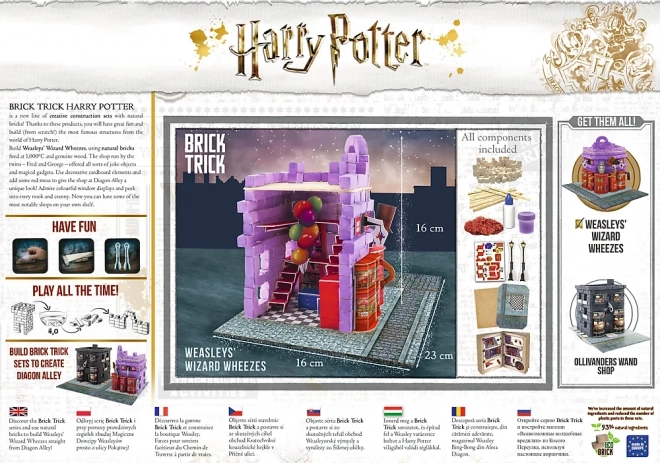 Adu magia acasă cu magazinul colorat al gemenilor Fred și George. Setul Brick Trick combină materiale reale – mini cărămizi și scândurele din lemn – cu decorațiuni care dau caracter construcției. Pas cu pas vei ridica clădirea de la temelie până la modelul final, pe care apoi îl vei înfrumuseța cu elementele incluse.