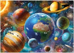 Piesele de puzzle neon dezvăluie o imagine uimitoare a planetelor cu elemente detaliate, inclusiv Saturn și Pământul.