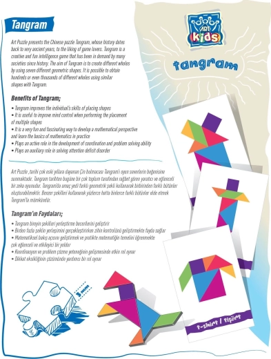 Misterul ascuns în puzzle. Scopul jocului Tangram este să creezi forme folosind șapte piese geometrice diferite. Tangramurile sunt un joc chinezesc foarte vechi. Nimeni nu știe exact când și cum a apărut. Potrivit unei legende de peste 1000 de ani, un bărbat pe nume Tan a scăpat pe jos o placă, iar aceasta s-a spart în 7 părți. Când a încercat să o reasambleze în formă de pătrat, a descoperit că se pot crea o mulțime de forme diferite.