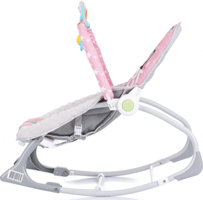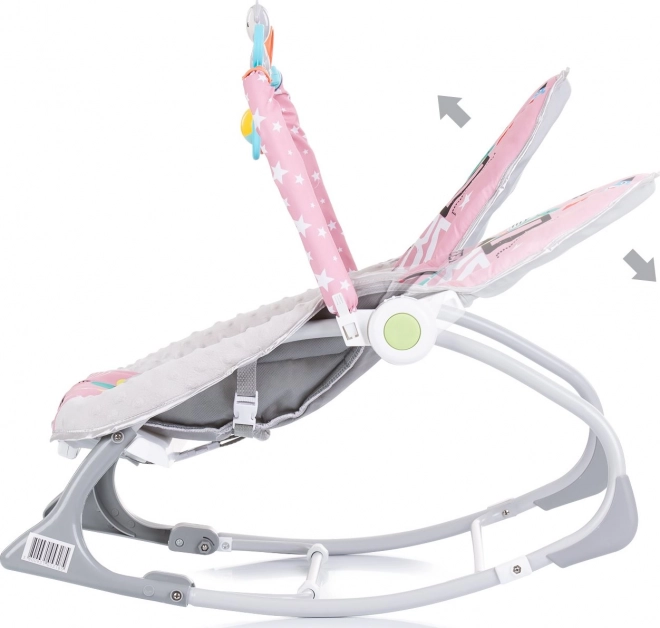 CHIPOLINO Baby Spa este un șezlong practic pentru copii, care crește odată cu bebelușul. Datorită soluției 2-în-1, funcționează inițial ca balansoar pentru nou-născuți (până la 9 kg), iar mai târziu ca scăunel pentru copiii care stau singuri (până la 18 kg). Vibrațiile delicate și melodiile calmează și ajută copilul să se odihnească, în timp ce arcul cu jucării suspendate susține dezvoltarea coordonării vizuale și motorii.