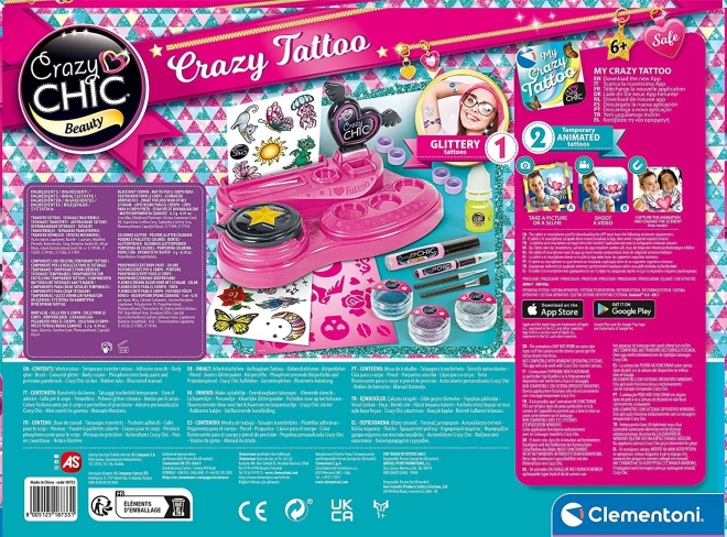 Creează-ți propriile tatuaje temporare cu sclipici, șabloane și un colorant de corp luminos special. Setul stilat CRAZY CHIC oferă o măsuță de lucru practică și suport pentru realitate augmentată (AR) în aplicația Crazy Tattoo – designurile tale prind viață în 3D magic, pe care le poți fotografia, edita și distribui pe rețelele sociale.