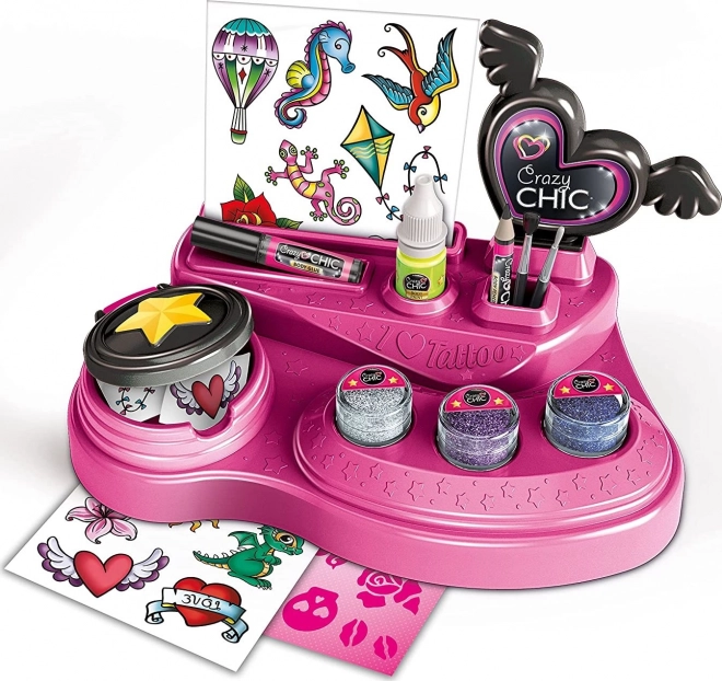 Descoperă lumea distractivă a creativității cu setul pentru fete de tatuaje temporare CRAZY CHIC. Datorită dotării bogate – șabloane autoadezive, sclipici colorat și colorant de corp cu efect luminos – creezi un look original pentru orice ocazie. Măsuța de lucru practică păstrează toate accesoriile laolaltă și ușurează aplicarea.