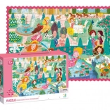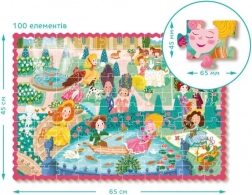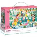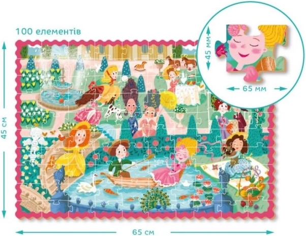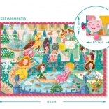 Puzzle vesel pentru copii, pentru micii iubitori de povești: 100 de piese cu motiv cu prințese la promenadă, cu dimensiunea 65 × 45 cm. Ideal de la 5 ani, sprijină dezvoltarea gândirii logice, răbdarea și motricitatea fină. Cutia practică cu mâner pentru transport ușor asigură distracție acasă și în călătorii.