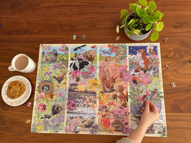 Descoperiți farmecul celor patru anotimpuri cu acest puzzle de calitate de la GIBSONS. Puzzle-ul cu 1000 de piese oferă o ilustrație detaliată, care va încânta atât începătorii, cât și pasionații experimentați. Dimensiunea după asamblare este de aproximativ 68 × 49 cm, ideală pentru înrămare sau pentru refacere repetată.