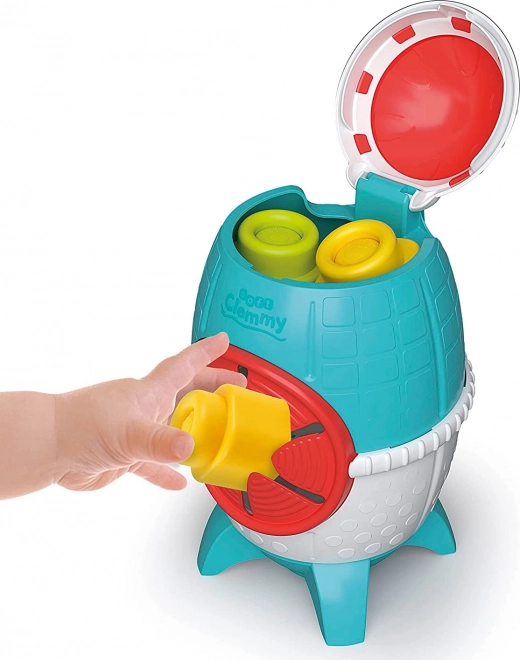 Designul rachetei cu capac și deschidere laterală transformă cutia într‑o jucărie inteligentă și un spațiu de depozitare practic. Copiii exersează introducerea, scoaterea și coordonarea mână‑ochi.