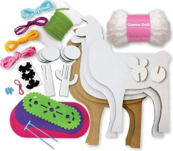 Conține toate materialele necesare pentru realizarea unei llamas, inclusiv decupaje din carton, fire colorate și bucăți de țesături.