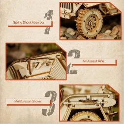 Modelul include elemente realiste cum ar fi roți robuste, arcuri, o pușcă de asalt și alte componente care adaugă la autenticitate.