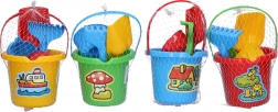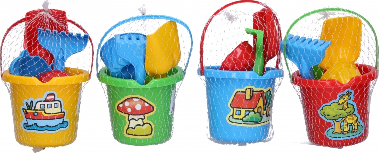 Set practic pentru copii, pentru nisip, cu o găletușă mică de 10 × 11 cm, ideal pentru locul de joacă și plajă. Conține găletușă, greblă, lopățică și 3 forme (peștișor, guguloi, rățușcă). Disponibil în 4 variante de culoare – albastru, roșu, galben și verde.
