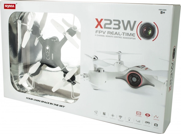 Este echipat cu un giroscop pe 6 axe, astfel zborul va fi foarte stabil, iar modelul va fi mai agil și mai manevrabil. În plus, are o cameră integrată cu transmisie video online pe ecranul telefonului și înregistrare la calitate 640×480p. Puteți așadar filma videoclipuri și realiza fotografii din aventurile voastre aeriene! Modelul poate fi controlat doar cu telefonul și chiar se poate programa o rută pe care modelul o va parcurge singur. Totul în aplicația mobilă. Nu doar în condiții de lumină slabă veți aprecia iluminarea LED cu care Syma X23W este echipată. Acest dron va distra întreaga familie, iar datorită dimensiunii sale îl puteți lua oriunde cu voi!