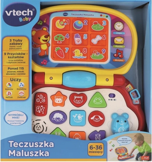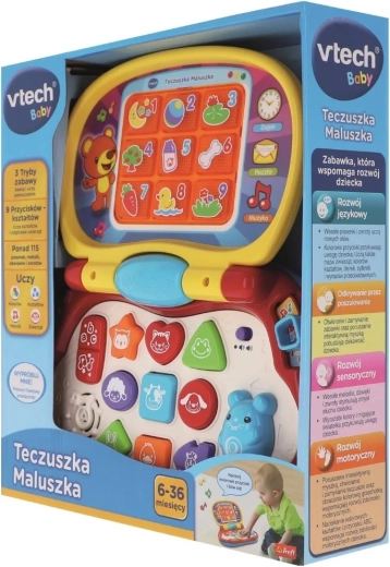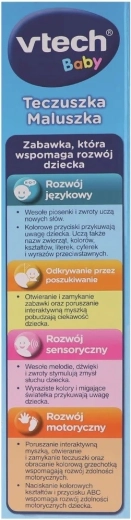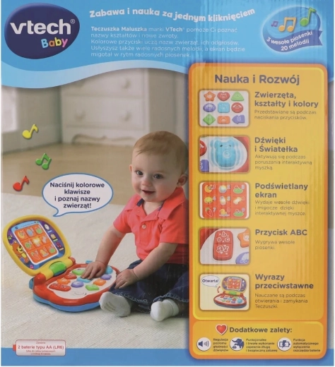 Oferă 3 moduri de joc care distrează și educă în același timp. Cu 9 butoane colorate, copiii învață culorile, formele, numele animalelor și sunetele lor. Atenția copilului este captată de 3 cântecele vesele și sunete amuzante. Apăsarea butoanelor susține dezvoltarea motrică a copilului. Luminile intermitente atrag atenția copilului. Prin ridicarea și închiderea capacului se învață cuvinte opuse.