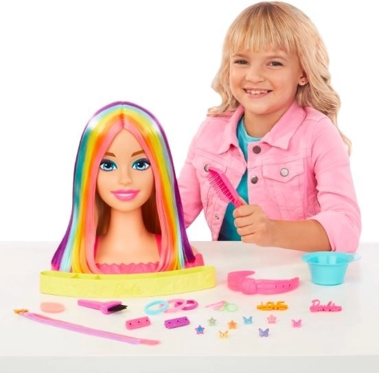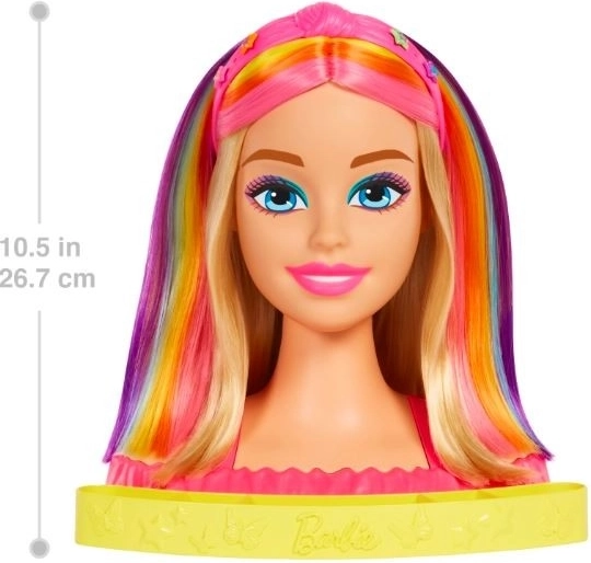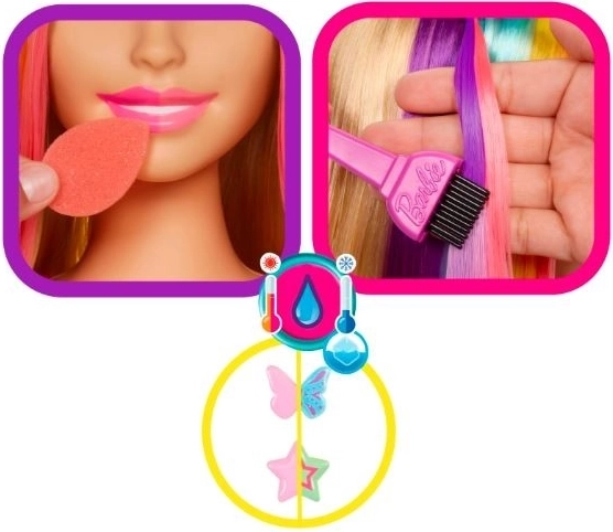 Cu capetele de coafat Barbie, oricine poate deveni hairstylist! Elementele cu schimbare de culoare adaugă jocului o notă magică, iar accesoriile îți lasă creativitatea să zburde. Alege dintre diferite modele cu coafuri unice și o mulțime de elemente de styling. Seturile includ și un spațiu practic de depozitare în baza capului, astfel încât, după joacă, toate accesoriile pot fi ușor puse la loc. Se vând separat, în funcție de disponibilitate. Culorile și elementele decorative pot varia.