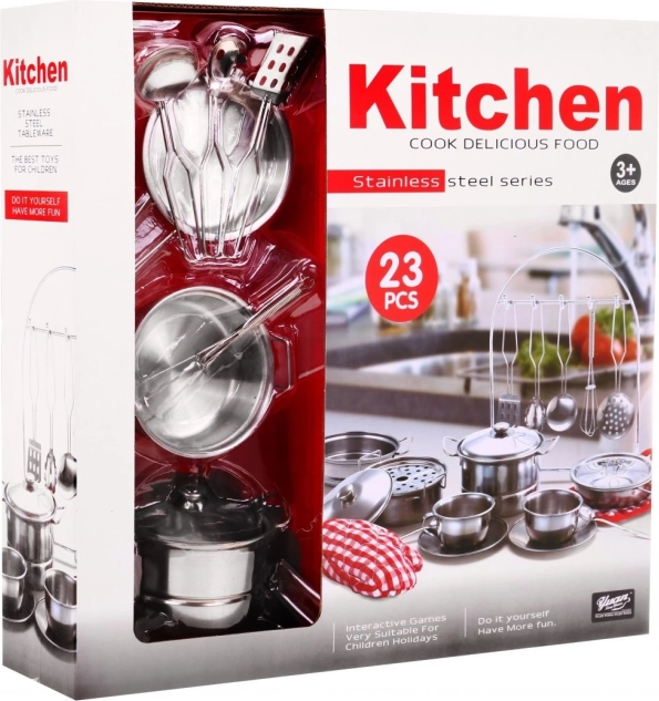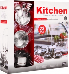 Acest set de bucătărie pentru copii din 23 de piese oferă o oportunitate excelentă pentru joacă creativă de roluri. Setul include veselă metalică reală și un costum textil de bucătar șef, care susține imaginația și dezvoltarea abilităților practice. Este potrivit pentru copii de la 3 ani și asigură ore de distracție.