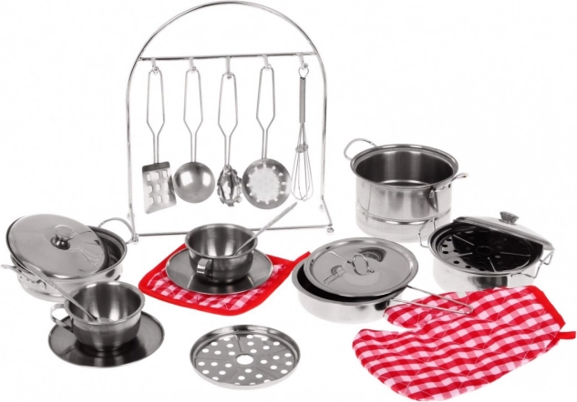 Acest set conține diferite oale, tigăi și veselă metalică pentru o experiență de joc autentică. Copilul se poate bucura de joacă cu ustensile de bucătărie care arată real.